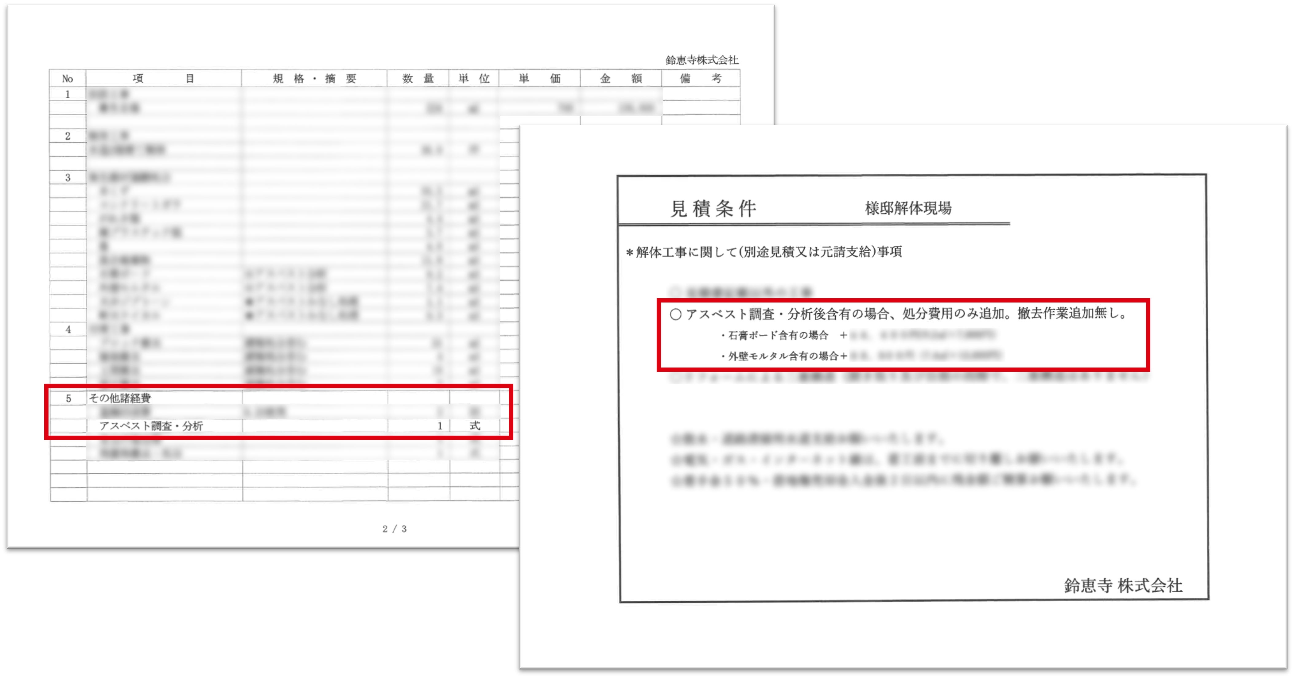 見積書へはこのように(画像②)アスベストの調査・分析費用、分析後アスベストが含有していた場合の割増費用、場合によってみなし判定する場合はその費用などを明記しております。割増金額に関しては、割増になるという話のみの企業様が多い中で、我々はお客様の立場に立って、金額まできちんと明確に記載しております。