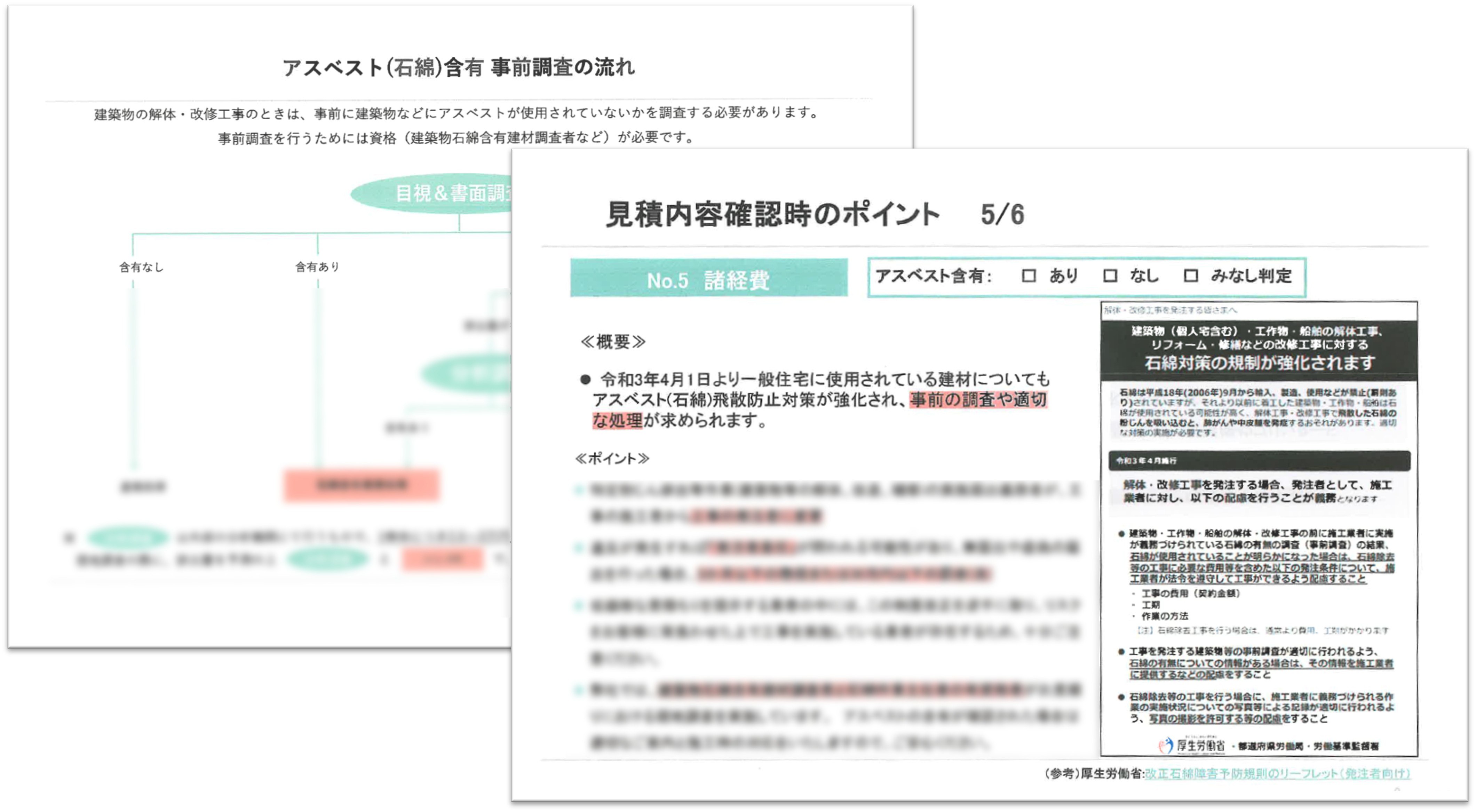 まず、弊社では見積もり書を提出する際にアスベスト対策費用も明確に示しており、見積もりのポイントをまとめた説明資料(画像①)と共にお見せしています。