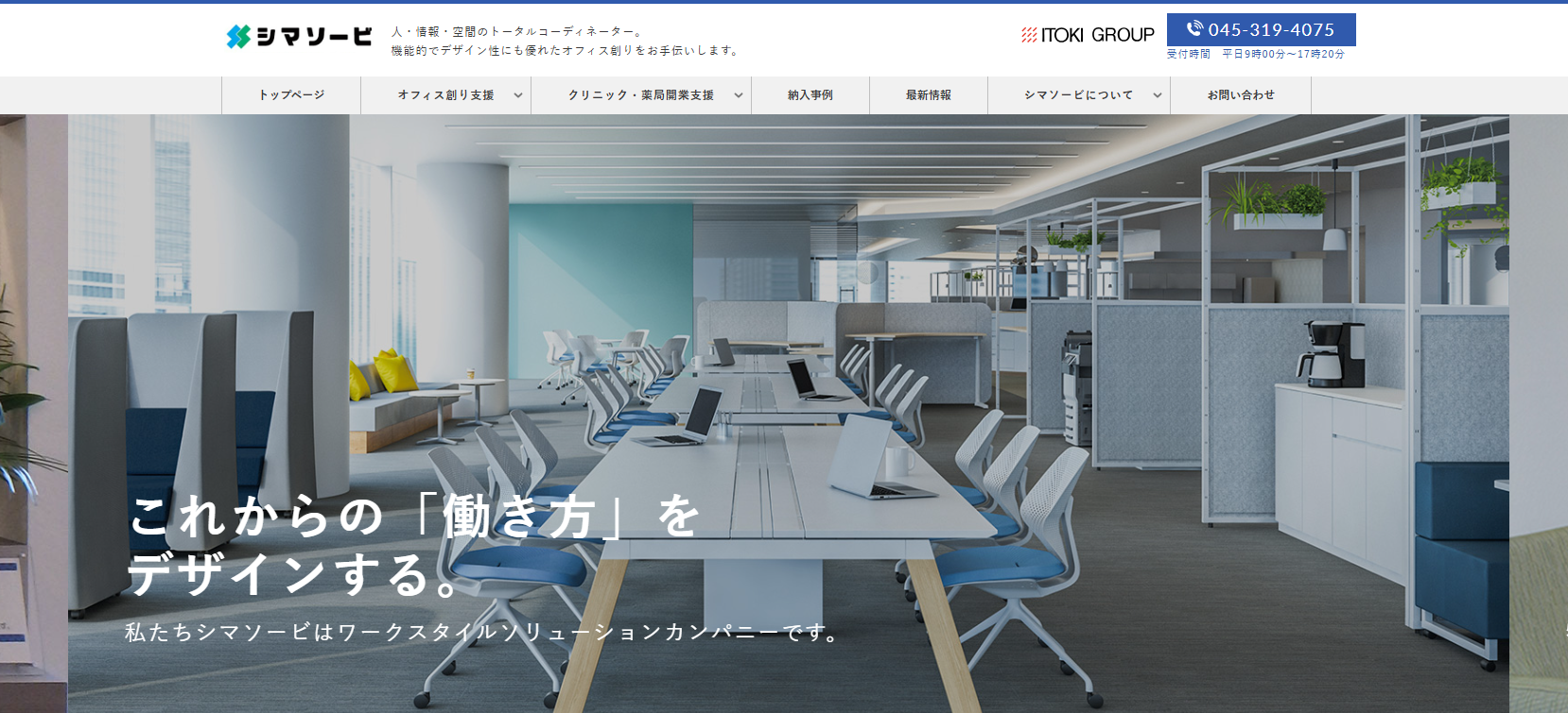 神奈川県内にあるオフィスのデザイン・施工・家具のコーディネートまで、オフィス環境を構築するお手伝いを行っている株式会社シマソービ。
