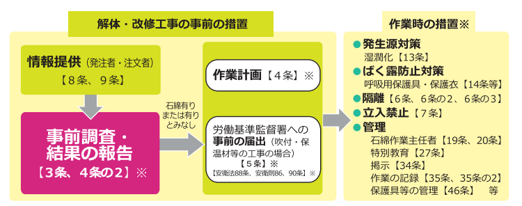 厚生労働省のリーフレットには、解体・改修工事の事前処置として、以下のような対応が必要になると記載されており、作業計画や労働基準監督署への事前の届け出、作業時の処置においてはみなし判定を行った際にも必要になってきます。