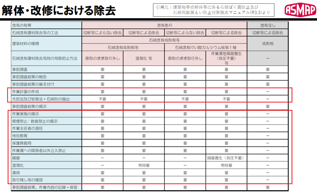 《成形板の石綿含有/不含有時の除去・撤去作業工程例 グループ会社 株式会社アスマップ提供》