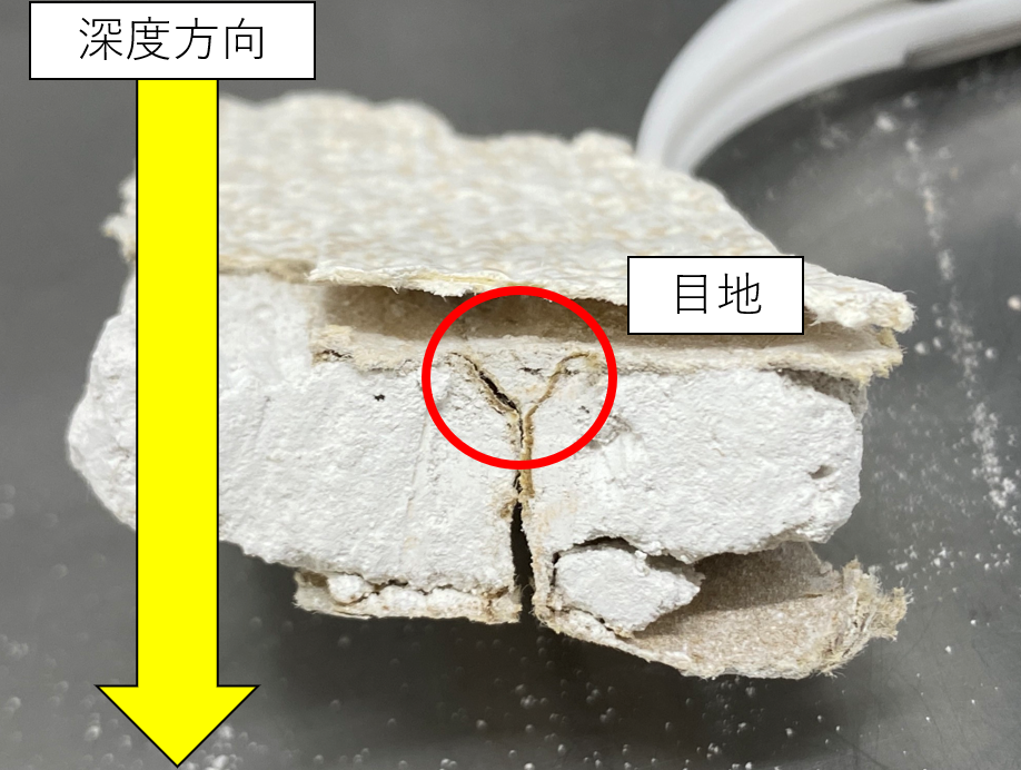 左画像のように、成形板の境目で採取されている場合、以下の対応といたします。 ①成形板については、試料サイズの大きい方を分析いたします。 ②目地材について分析が必要な場合は、分析依頼書_試料名の欄に 「クロス/目地/石膏ボード」のように指示をお願いいたします。