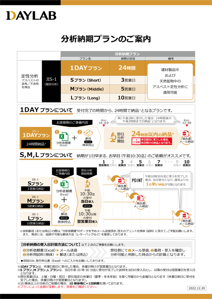 これまでS,M,Lプランの受付から分析までのリードタイムは、翌営業日起算でしたが、今回の改定により一部当日起算することで、S,M,Lプランの納期が実質1日、短縮可能となりました。