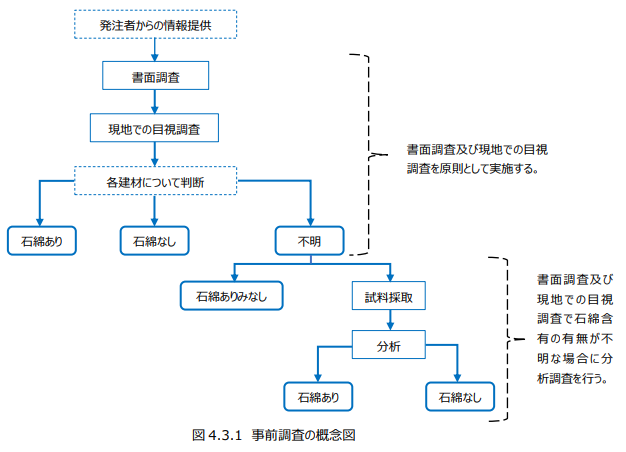 以下、厚生労働省の代表的な法令に「みなし」について記載されている内容を要約すると、 「”みなし”は、適切な措置(飛散防止、安全衛生等)を講ずる場合、分析調査を省略できる」と記載されています。 みなし判定は、あくまで分析調査を省略できるものであって、「書面調査/目視調査」「調査結果報告書の作成/届出」その他必要な措置を簡略化できるものではない、ということです。