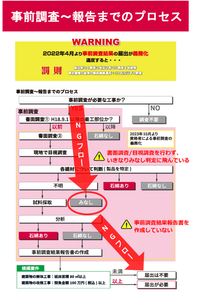 昨今のアスベストに対する法規制の強化から、今後一層厳しい取り締まりが行われることと予想します。皆様におかれましても、適切な対応を実施頂ければと思います。