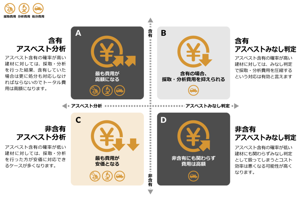 - 採取・分析、みなし判定でそれぞれ発生する費用は、「アスベスト含有の確率」から対応を選択する形がベスト。アスベスト含有の確率が低いにも関わらずみなし判定として扱ってしまうと、コスト効率は悪くなる可能性が高い。