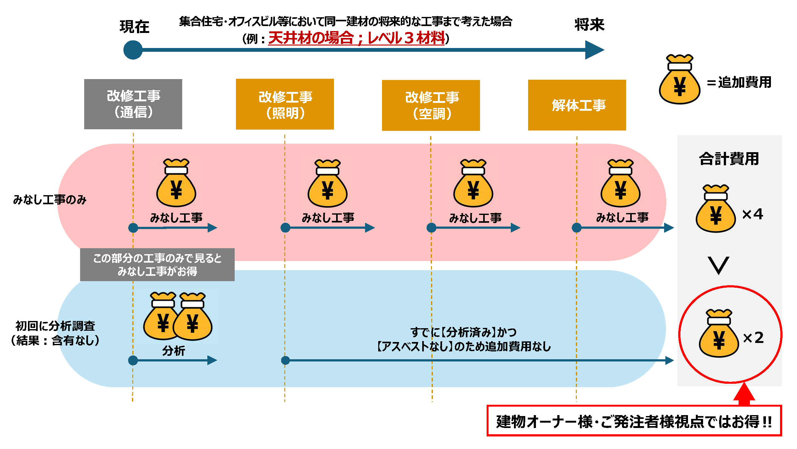 アスベスト分析の結果、弊社の実績上7~8割は非含有であることを説明しましたが、それに加えて長期的なコストを考えた際にも費用を抑えることが出来るメリットがあります。 下記の図表では、集合住宅やオフィスビル等において同一建材の将来的な工事まで考えた場合の合計費用に関して、「みなし判定」で工事を進めた場合と分析調査を行った場合それぞれを表しています。