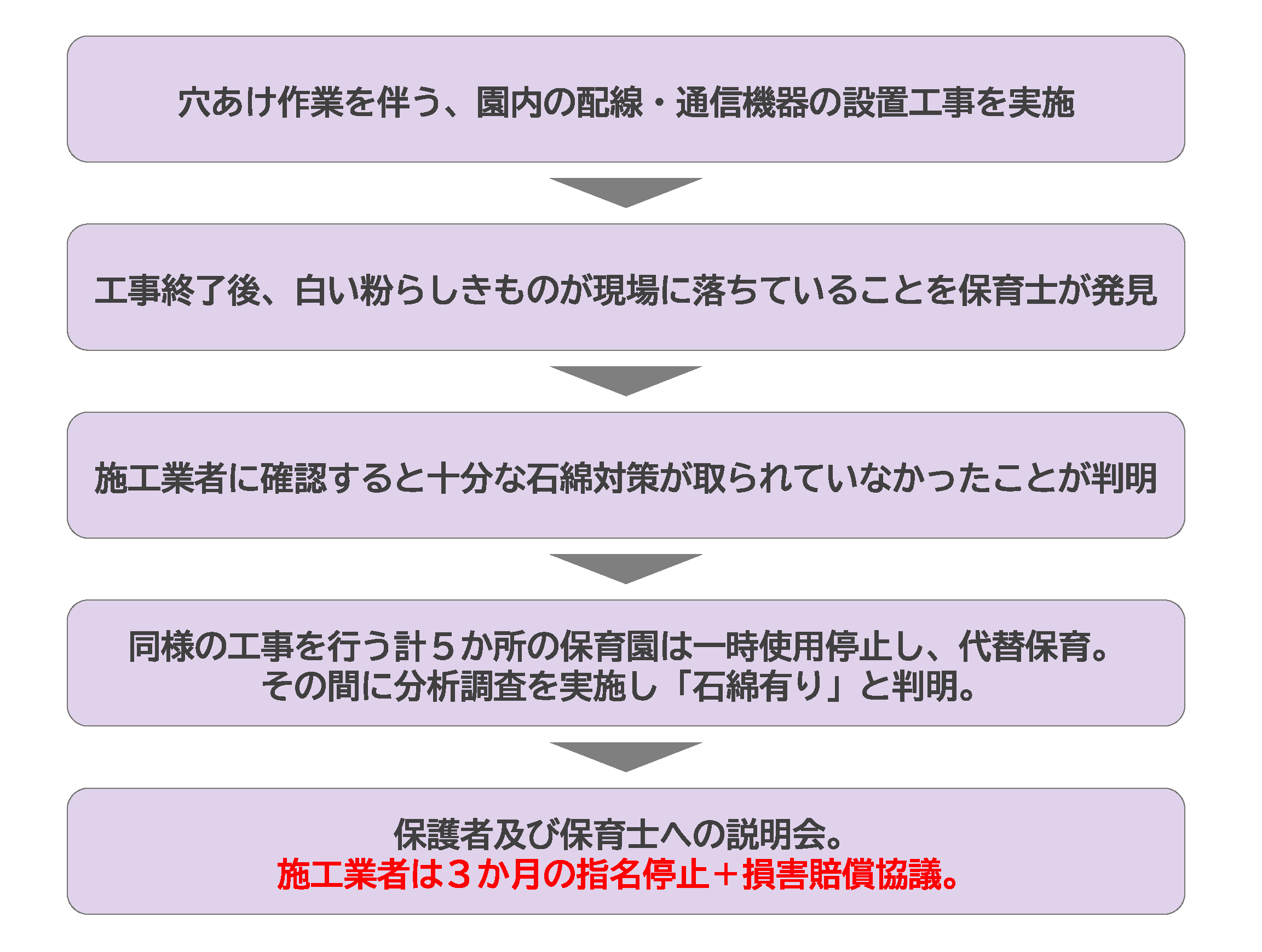 本来であれば、建材の破壊・加工を伴う作業に先立って、アスベストの事前調査を基にアスベストに対して十分な飛散防止対策をすることが法令で義務付けられています。しかしこの現場では、十分な対策を講じなかったことが原因で、アスベスト飛散という深刻な事態を招いた形となりました。