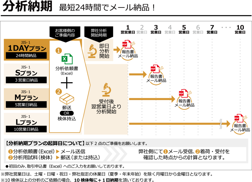 デイラボではJIS-1分析に特化しており、精度の高い分析を検体到着後(持ち込みもしくは郵送)最短24時間で実施し、結果が出たら即時メールで報告を行います。