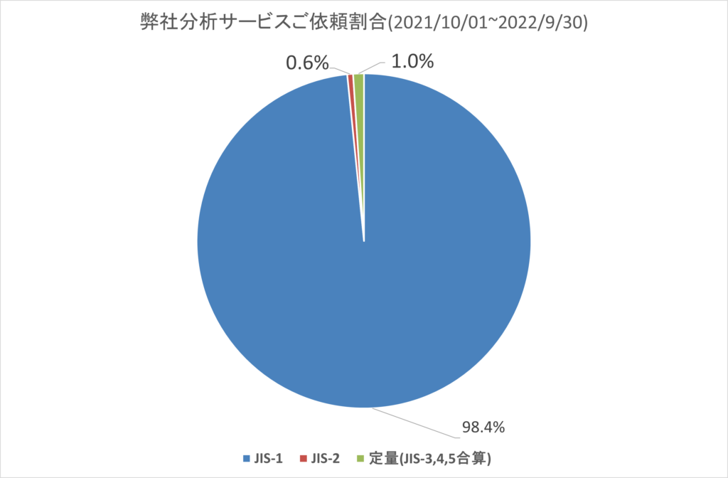 定性分析のうち層ごとの分析が可能なJIS-1によって行うのが望ましいと言えるでしょう。実際、デイラボにご依頼いただく分析も全体の98.4%がJIS-1による分析です