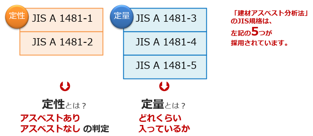 • アスベストの事前調査として必須なのは「定性分析」(JIS A 1481-1、JIS A 1481-2)