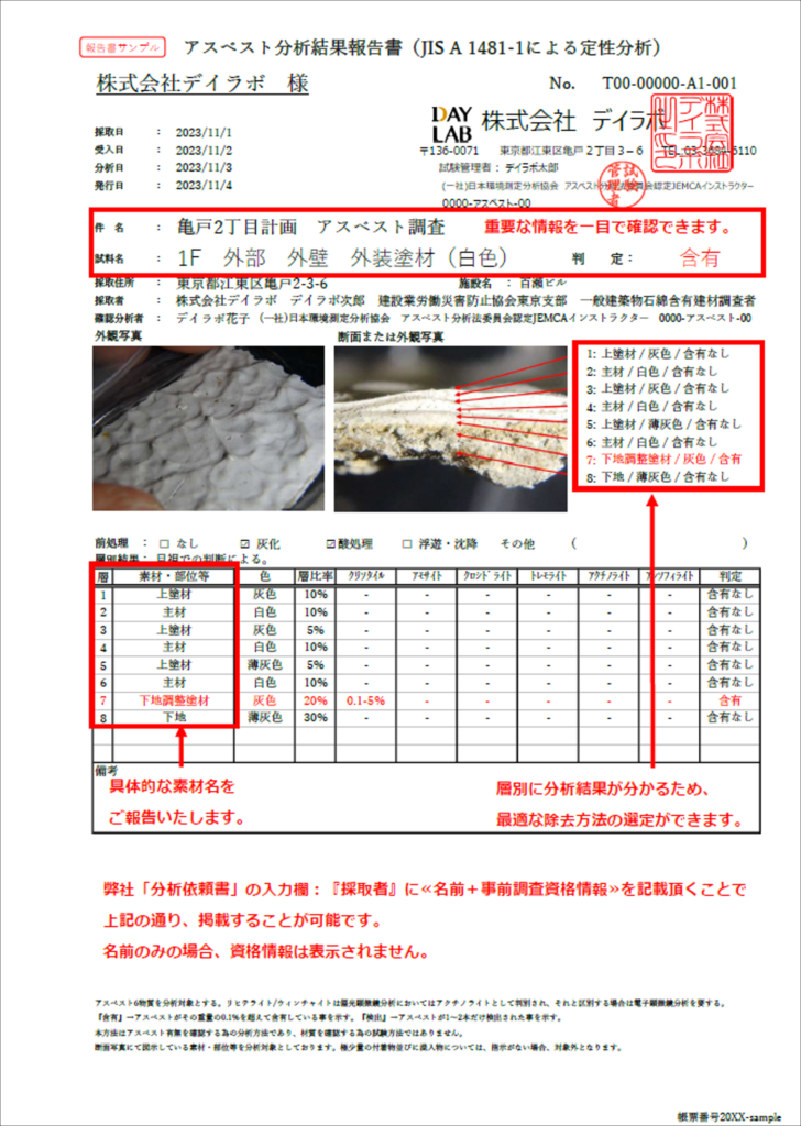 分析レポート(メールにて送付)は試料の外観写真・検体の断面写真・層別の分析結果を1枚にまとめた非常にわかりやすい形で提示できることも大きな特徴です。