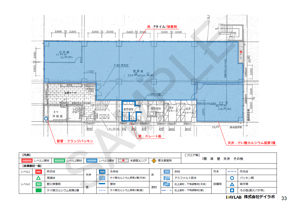 オプションで別途料金とはなりますが、ご希望に応じてアスベストマップを作成いたします。アスベストマップとは調査対象においてアスベストが含有している建材の範囲を示す資料です。