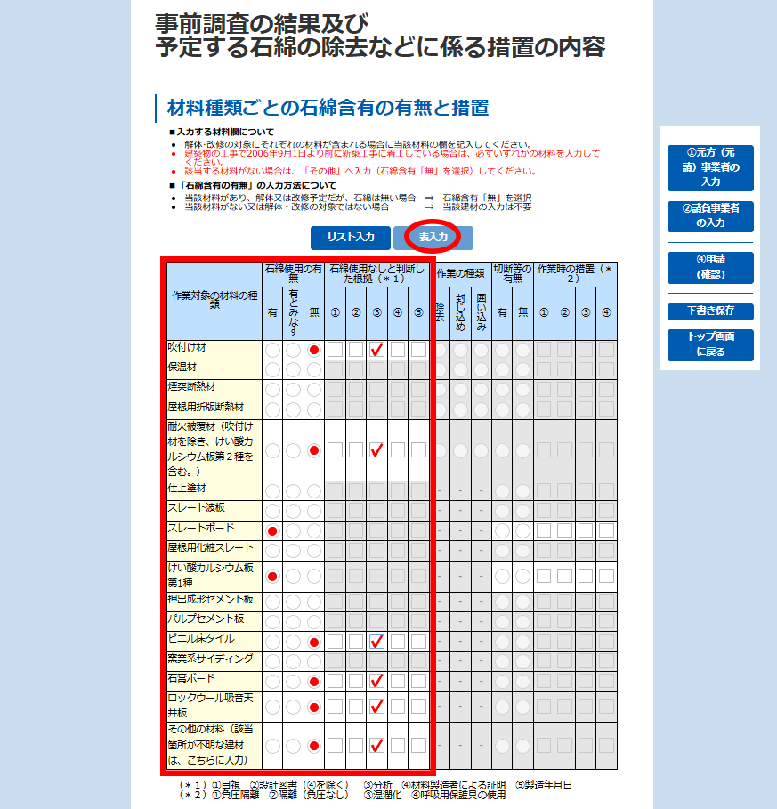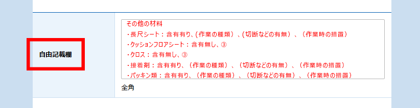 調査結果を基にGビズにおいての⦅材料種類ごとの石綿含有の有無と措置⦆の項目へ入力しましょう。「リスト入力」ではなく「表入力」を選択するとデイラボの報告書と同じ表記となりますので入力の際に分かりやすく便利です。 結果を基に「石綿使用の有無」「石綿なしと判断した根拠」を選択し、結果を踏まえた「作業の種類」「切断などの有無」「作業時の措置」についても選択を忘れずに行いましょう。 また、リストに名前のない材料種類(名称)や同じ建材でも違う箇所で2試料の採取している場合等については、その他の建築材料に記載+自由記載欄に材料名や各判断、作業の種類等を記載することが望ましい(下記添付画像参照)と考えられています。 ※自由記載欄は「①元方(元請)事業者の入力」を選択し前の画面へ戻ると、一番下にございます。