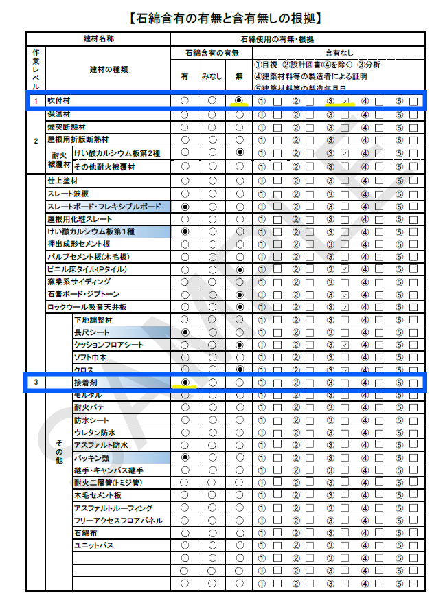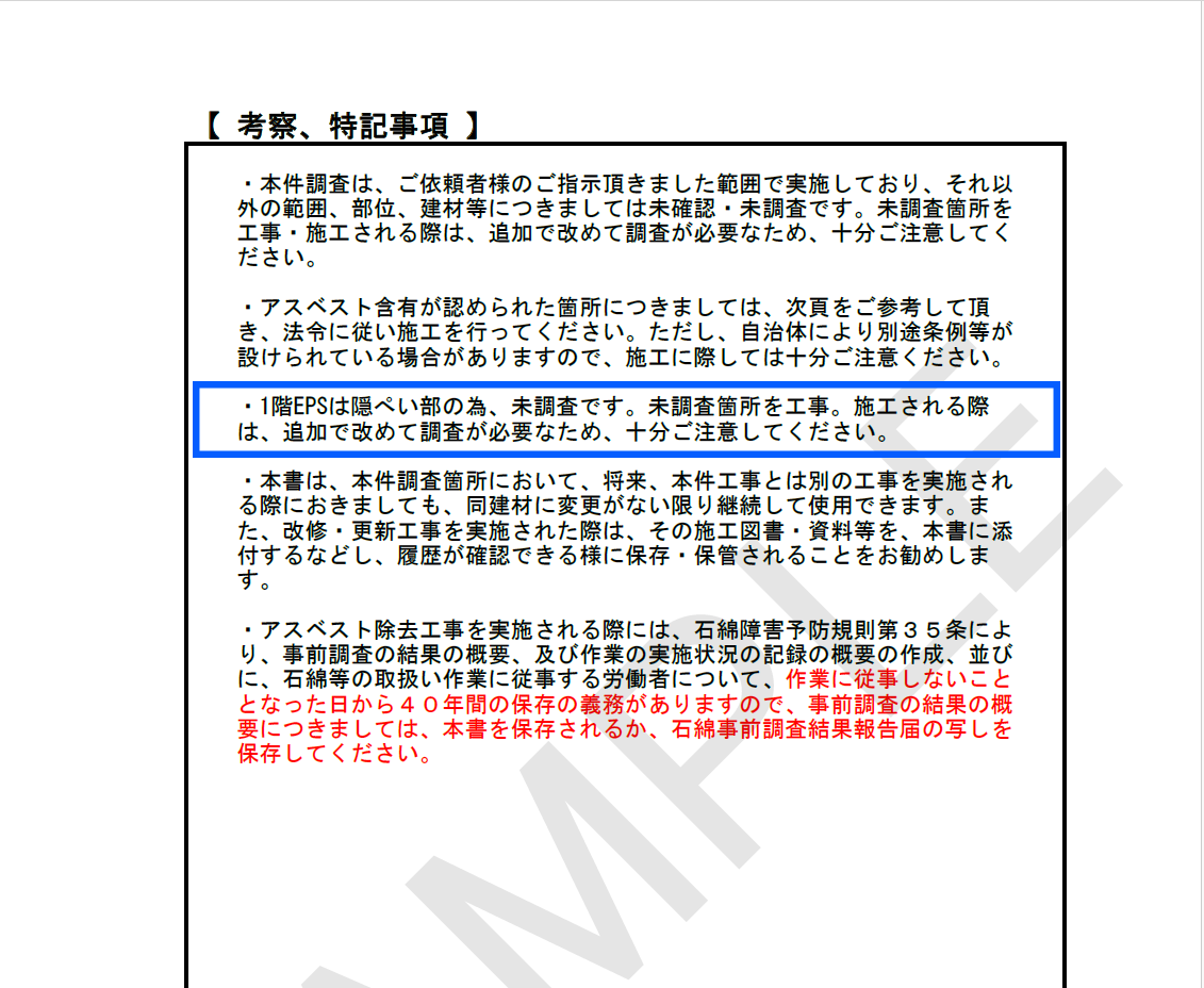 破壊しないと調査できない場所であって解体等が始まる前には調査できなかった箇所については、解体等開始後に確実に調査がなされるよう上記のような記載をしております。 <非含有の場合>
