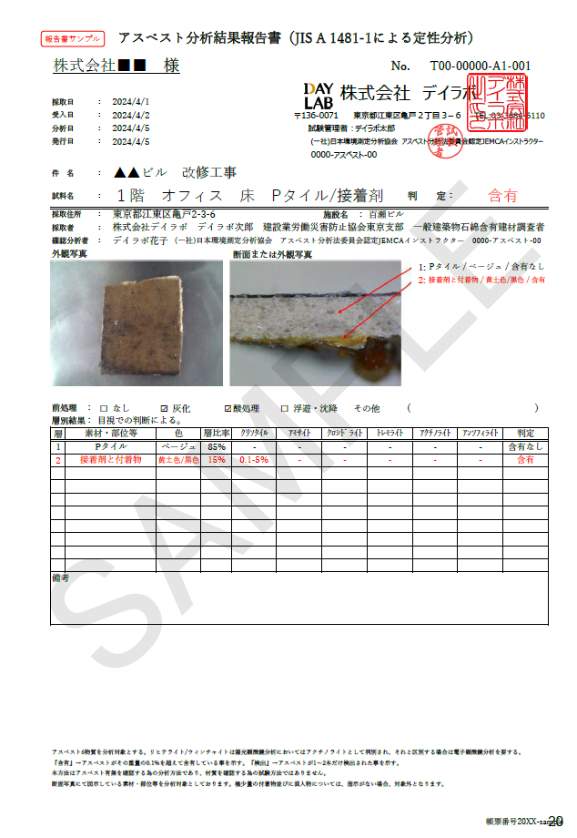 最後に分析結果報告書がございます。 デイラボの分析結果報告書は、結果一覧表と1検体1ページで完結する検体ごとの報告書のみという非常にシンプルな構成であり、簡単・明瞭さが特徴です。また、試料の外観写真、断面写真と共に、層別の分析結果がすべて1枚で確認出来るようになっております。 分析結果報告書につきましては、別記事にて読み方ガイドを掲載しておりますので併せてご参照ください。