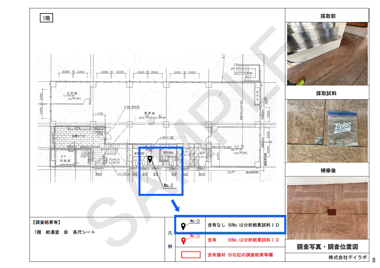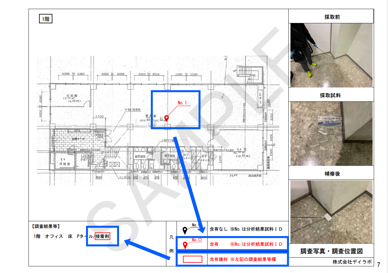 上記の添付画像は「含有」時の調査位置図と採取箇所の写真です。 スポットマークのあるサンプリングポイントの部分に赤文字で「No.1」と記載があることから、分析結果試料ID「1」は分析調査の結果アスベストが「含有」していることを示しています。 また、含有していた建材は「接着剤」の部分であることを、左下部にある調査結果等の項目において対象建材を赤く囲うことで示しております。 <非含有の場合>