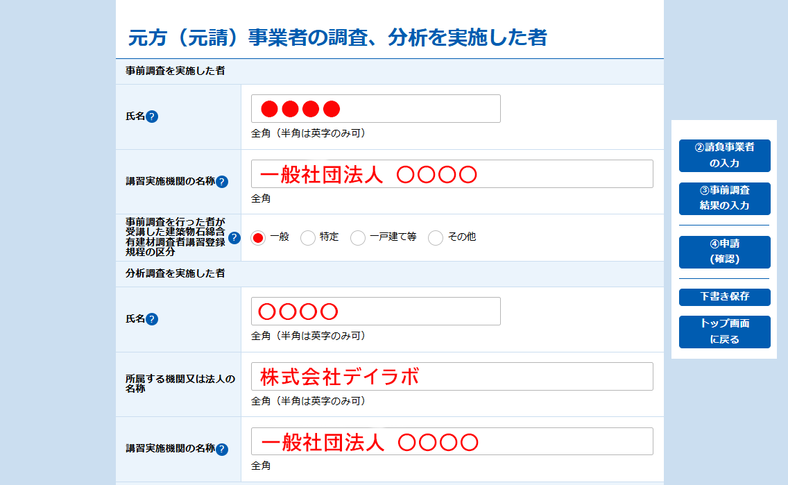 調査者・分析者の情報は、上記のような工事の際に作業内容を掲示する工事看板等においての⦅調査者を行った者(分析等の実施者)⦆の項目へも記載が必要です。こちらも併せて忘れずに行いましょう。