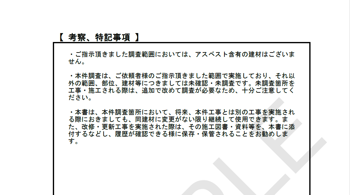 調査概要後には調査結果が1ページで確認出来るようにまとまっております。 作業レベルごとに上から建材が記載され、調査対象の建材においてアスベストの含有有無が●で選択されます。含有無しの場合はその根拠が「設計図書」「分析」等から選択され一目でわかるような記載がされています。 また、調査箇所の範囲の小ささ等によっては「みなし」の判断を行うかどうかお客様に確認をさせていただきます。その際にお客様が「みなし」を選択される場合は「みなし」を●で選択いたします。 結果一覧表は、「調査箇所のうち、どの試料からアスベストが出たか」を確認するのに使用しやすいページです。 そして一覧表と併せて次ページには調査の「考察・特記事項」を添付しております。