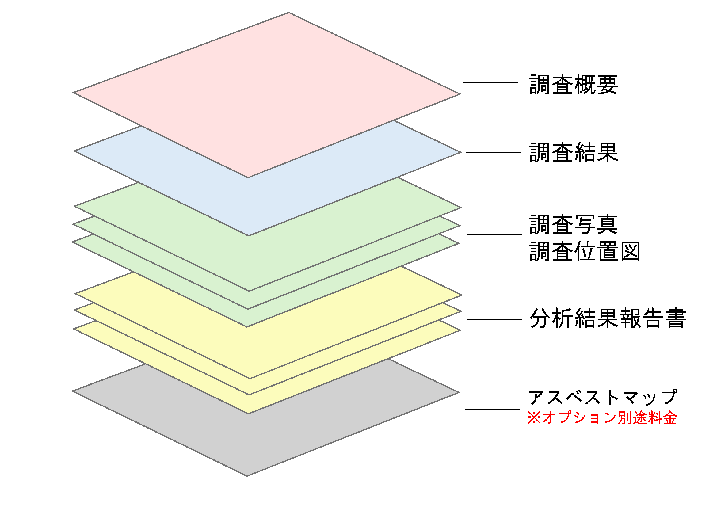 まず、報告書全体の構成についてお伝えします。 デイラボの調査結果報告書は、調査概要、調査結果、調査写真・調査位置図、分析結果報告書という造りで構成されています。また、状況に応じて必要な場合はオプションとしてアスベストマップ(アスベスト含有建材の範囲図)を追加することが出来ます。 デイラボの調査結果報告書は大防法や石綿測に則った内容でまとめており、皆様に信頼をもって利用いただける報告書となっております。また、調査位置図にサンプリングポイントを示していることや、アスベストマップというアスベスト含有建材の範囲図も作成可能なことで、その後の除去等の工事の際にも役立つ情報を提供出来る点が特徴です。