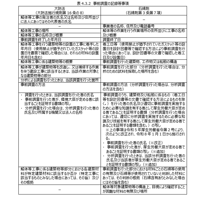 調査結果報告書は大気汚染防止法及び石綿障害予防規則に基づいて記録すべき事項(下記参考画像)が法律で定められております。デイラボの調査結果報告書はそういった法律に則った内容を正確に記載し、工事の際に有効な情報等もまとめて作成をしております。