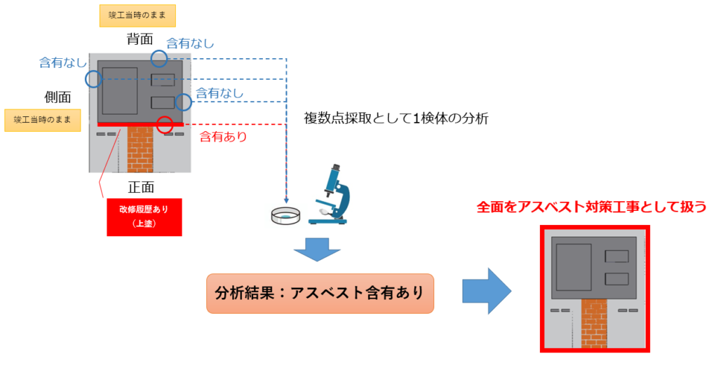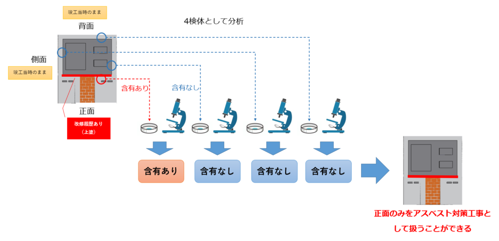 例えば、正面・側面×2・背面の仕上塗材を採取し、それらを1検体として分析を行ったとします。